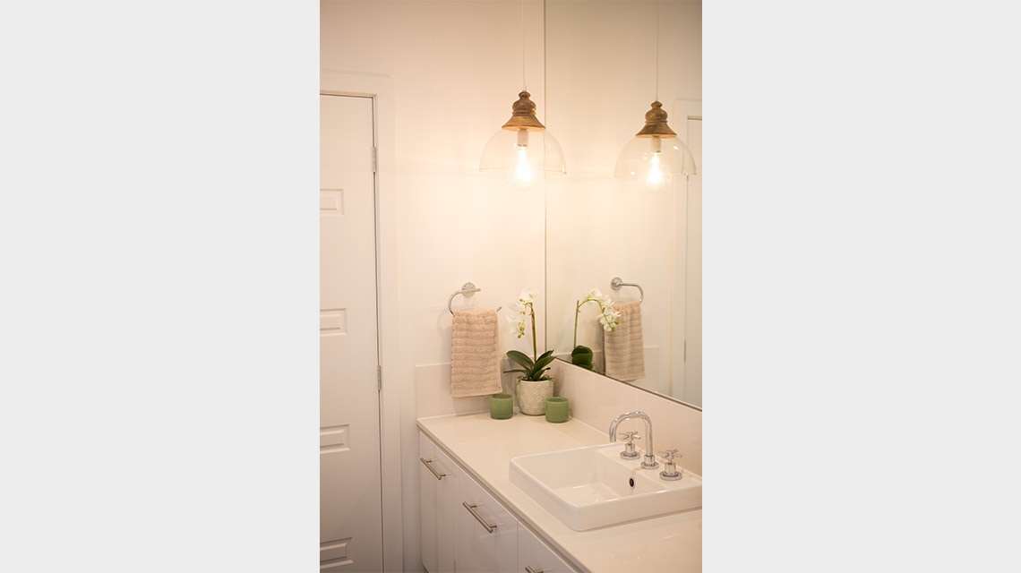 Feature lighting in the bathroom is always a good idea. The wooden accent is a rustic touch.