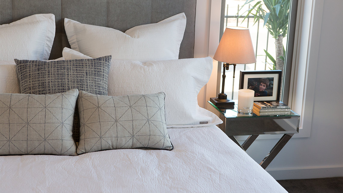 A traditional buttonhole bedhead complements the more modern geometric pattern of the cushion.